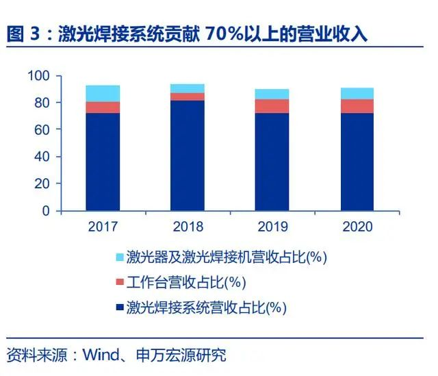 激光焊接系统贡献大头营收、动力电池领域营业收入占比超过 70%。1)从产品角度来看:公司产品包括激光器及激光焊接机、工作台和激光焊接自动化成套设备产品,2020年收入占比分别为 7.95%、10.44%、71.87%,公司产品主要以激光焊接自动化成套设备为主。2)从下游应用领域来看:2020 年,公司在动力电池、五金及汽配、IT 消费电子三大应用领域的营收占比分别为 70.09%、13.64%、8.43%,公司产品下游行业应用主要集中于动力电池领域。