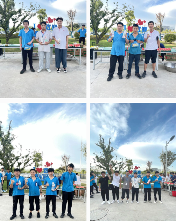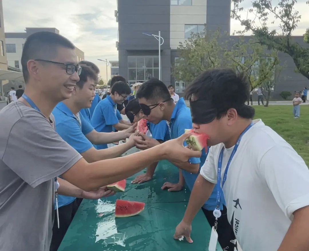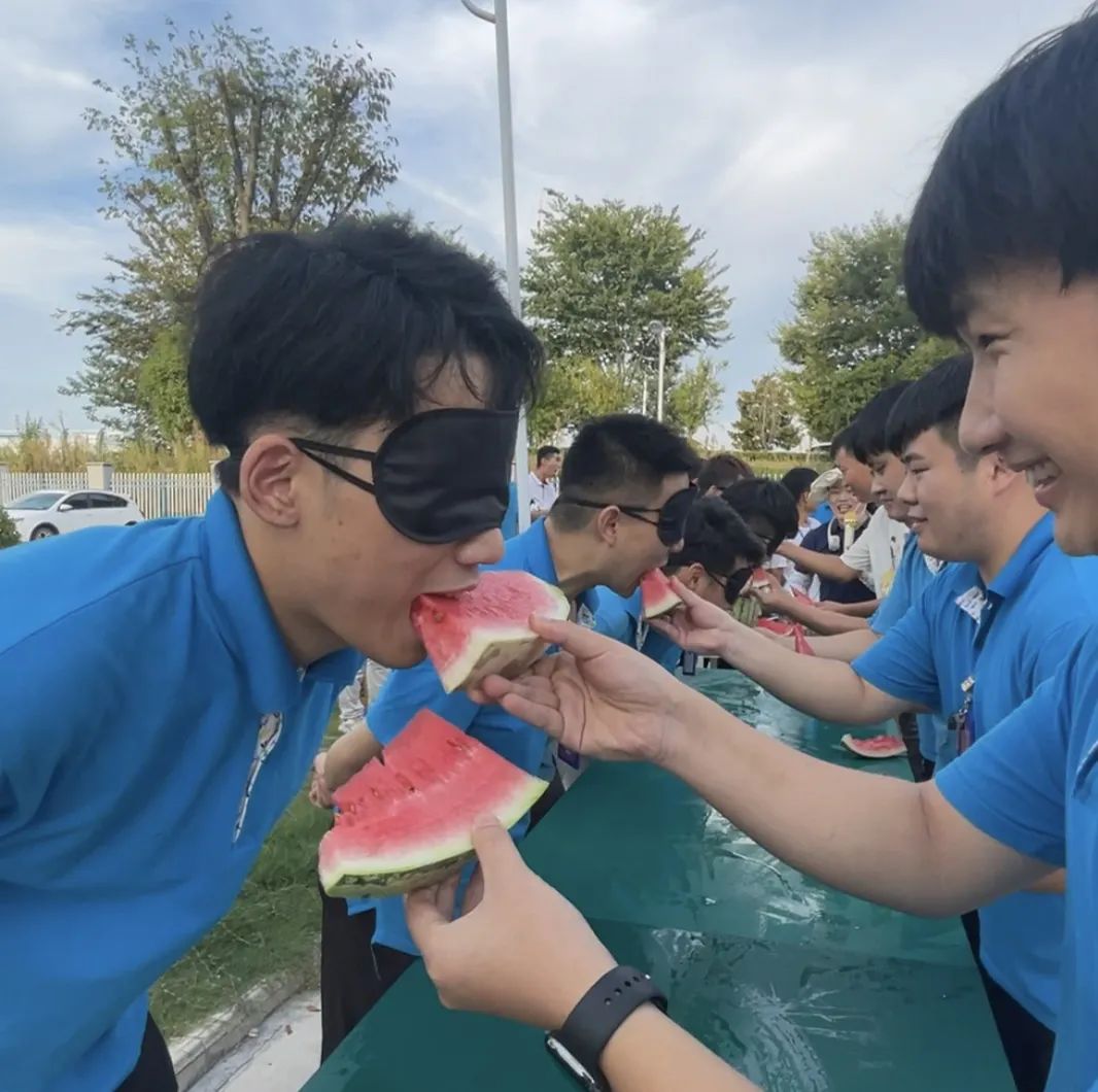合作共赢:员工两人成团,分五组一轮进行比赛,甲负责喂西瓜,乙被蒙眼负责吃西瓜,过程中乙不可以手接触西瓜,触犯规则则淘汰,每轮最快吃完的前三个团队可获得奖品。
