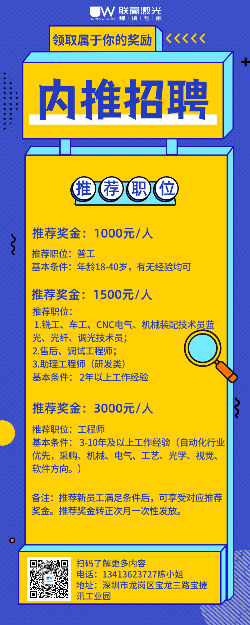 联赢激光激光始终坚持联合共赢的企业价值观,重视每个岗位人才的发展渠道,给予多种培育和晋升机制。