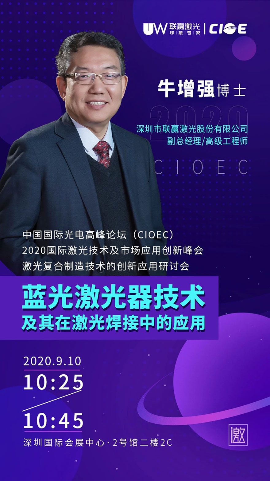 联赢激光激光将携蓝光激光器、锡焊以及新能源汽车行业、电池行业、3C电子行业、通讯行业等多领域解决方案创新成果亮相此次CIOE中国光博会。副总经理牛增强博士将于9月10日上午在激光复合制造技术的创新应用研讨会进行关于“蓝光激光器技术及其在激光焊接中的应用”的专题演讲,并与海内外光电行业专家共同探讨光电领域的最新技术和研究方向、光电行业热点和市场趋势。