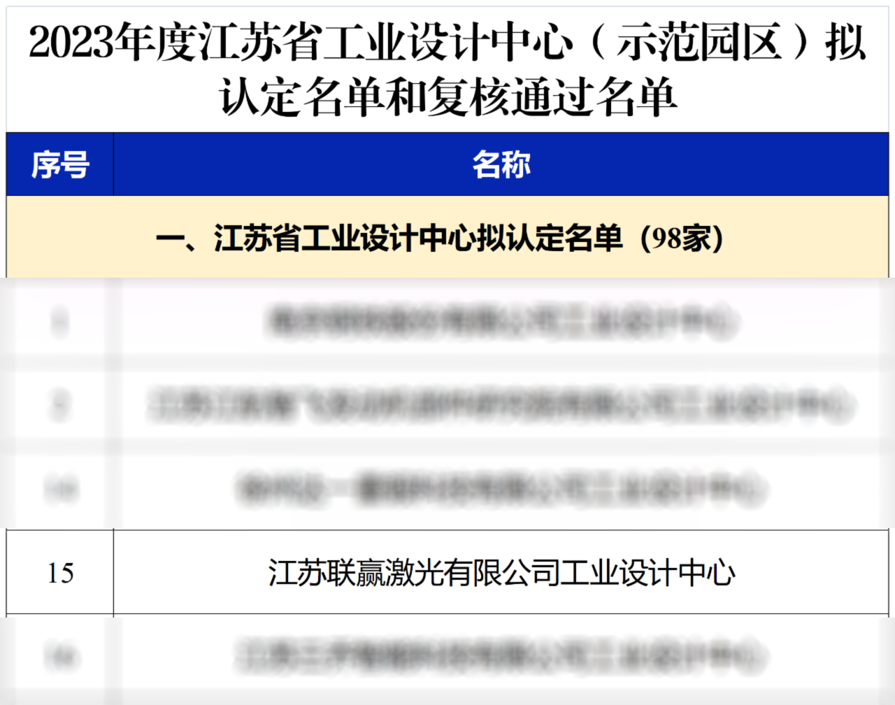 近日,江苏省工信厅公示了2023年度江苏省工业设计中心(示范园区)拟认定和复核通过名单,江苏联赢激光激光有限公司工业设计中心凭借完整的工业设计和突出的科技创新能力成功入选。这是联赢激光激光获广东省工业设计中心、广东省精密激光焊接装备工程技术研究中心、广东省汽车激光智能焊接装备企业重点实验室认定以来,又一个被认定的省级技术创新平台。