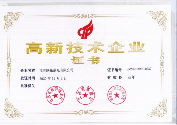喜讯!“江苏联赢激光”荣获“国家高新技术企业”认证